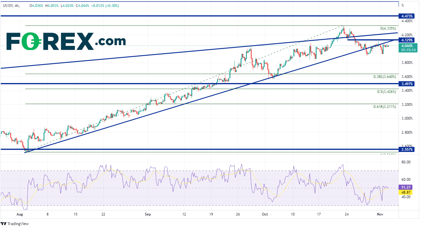 11月的FOMC会议临近,10年期美债收益率已经回落,并在4%左右震荡。如果关键收益率在FOMC会议后向上突破,首个阻力位在10月24日低点4.13%附近,然后是长期楔形的顶部趋势线4.23%附近。如果收益率继续走高并突破10月24日的高点4.335%,它可能会升至4.473%,即2007年11月以来的最高点位!然而,如果未能突破阻力位且10年收益率走低,则第一个支撑位在8月2日低点到10月21日高点区间的38.2%斐波纳契回撤位,既3.64%。在此下方,收益率可能跌至6月14日的高点3.497%,然后是前述区间的50%回撤位3.426%。