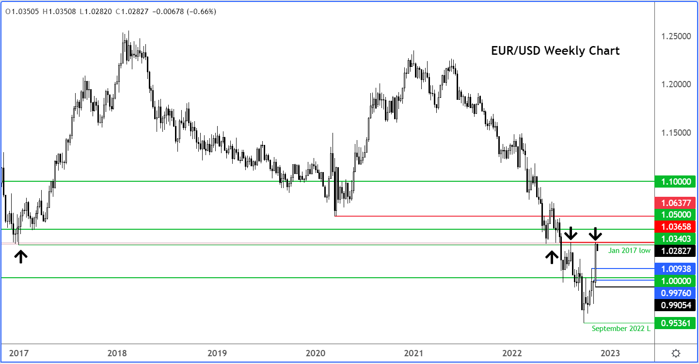 欧元/美元上周经历大幅反弹,升破位于2017年低点1.0340附近的第一重阻力位,导致价格短期出现“超买”,价格自此高位开始下跌。目前来看,下一个支撑位将在1.0200附近,如果失守,该货币对将从上方对在1.0090附近的区域再度试探。