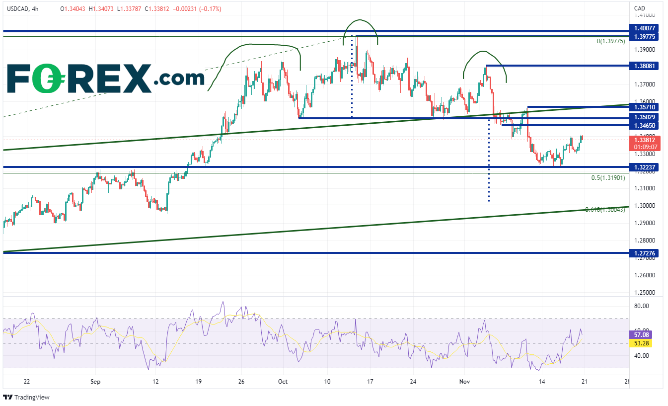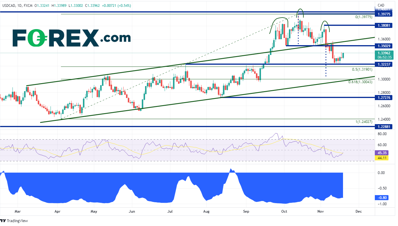 与许多美元货币对一样,美元/加元自2022年春季以来一直在上涨。1013日,该货币对创下1.3978的高点并开始回落。值得注意的是,当天标准普尔500指数触底3502点。随着标准普尔500指数开始走高并最终形成头肩形态,美元/加元开始走低。该货币对在1110日突破了图形的颈线并移动至水平支撑位1.3224点。头肩形态的目标位是头部到颈线的距离加上突破点位。在本例中,颈线位于1.3050点附近。