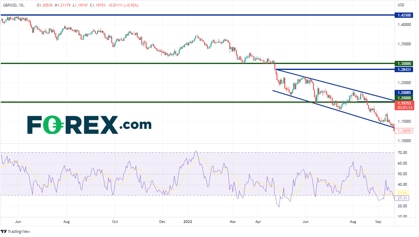 就在两个月前,英镑/美元交投于于历史最低位,触及低点1.03565。如今,该货币对竟然已经交投于1.1950附近!过去2个月发生了很多事情,使该货币对从崩溃的边缘回到到如今的点位。许多人将抛售归因于利兹·特拉斯,或者至少归因于她的迷你预算,因为这将在预算赤字中留下一个巨大的漏洞。尽管这可能是压垮骆驼的最后一根稻草,但在9月底的抛售之前,英镑/美元已经走低了几个月。英镑/美元在222日创下年初至今的高点1.4250!显然,随着美联储决定必须开始迅速加息后,该货币对持续走低。美联储最终判断加剧的通胀不是暂时的。422日,该货币对跌破1.3000,到6月中旬该货币对交投于1.2000。触及1.2000后,英镑/美元在通道中稳步走低,直到921日周三。该货币对收于1.1235,低于通道底部趋势线。为什么自1.4200以来持续走低?