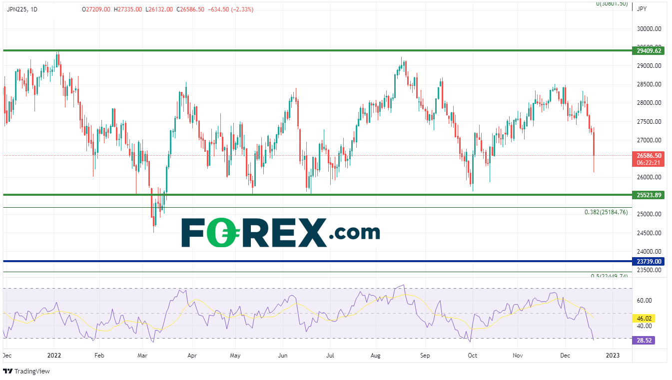 此外,日经225指数当天下挫约2.5%。考虑到美国股市昨日大跌,回调是预料之中的事,但日本央行略显强硬的鸽派态度加剧跌势,导致日经225指数以27209点开盘,日内最低点为26132点。与日本国债一样,日经225指数今年波幅整体限制在狭窄区间内。即便今日央行声明出乎市场预料,指数价格仍然保持在25524和29410之间的范围内。