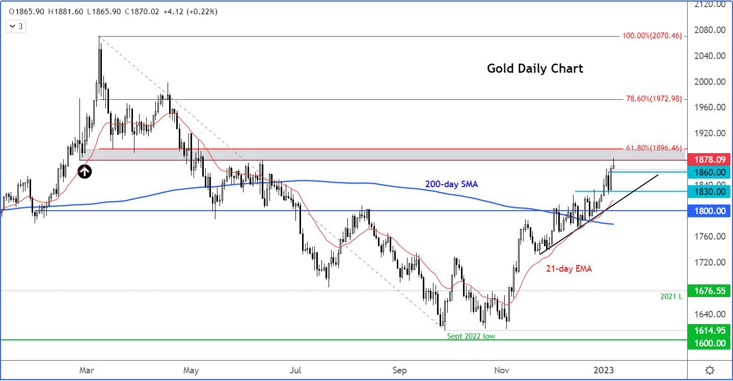 底端是黄金在2022年早些时候强势反弹时创造的阻力位,最终导致深度下跌。现在回到同一点位,我们可能会看到一定程度的回调。该区域的上端是相较于去年高点的61.8%斐波那契线,同时又是心理整数关口。空头需要在这里看到一些看跌的价格走势,至少确认暂时的顶部,因为最近几个月的趋势一直看涨。如果没有这样的确认,阻力最小的路径仍将是上行。干净利落地突破至该区域上方将进一步激励多头。