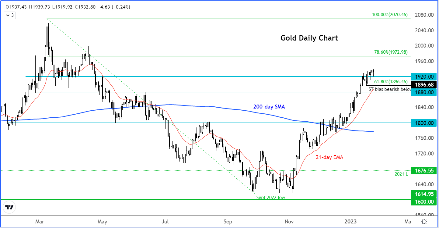 黄金在1920美元附近获得支撑,该点位过去曾是阻力位。只要它不打破更高的低点和更高的高点的结构,阻力最小的路径仍然是上行,因此不能排除向2,000美元进发的可能性。