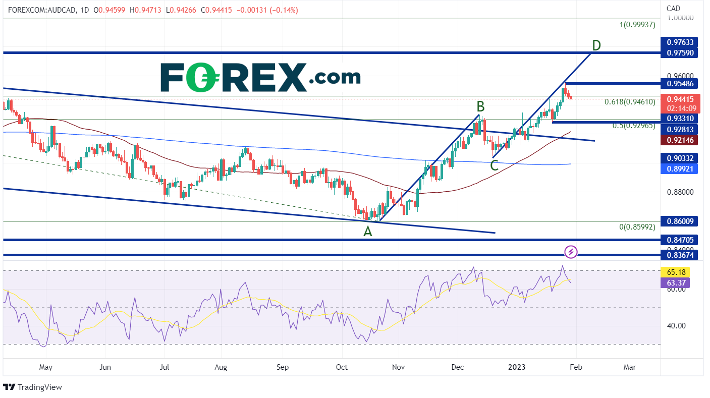 鉴于每周美元、英镑和欧元波动性较大,如果交易者想要求稳,澳元/加元是优选。202210月至今,货币对节节攀升,在升至20212月高点与202210月低点的61.8%斐波那契回档位后,近期出现回调。投资者不妨观望澳元/加元会否继续走高,能否上探AB=CD形态目标位0.9749