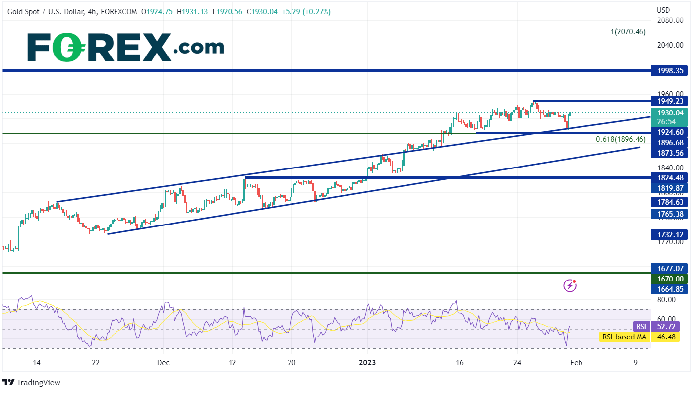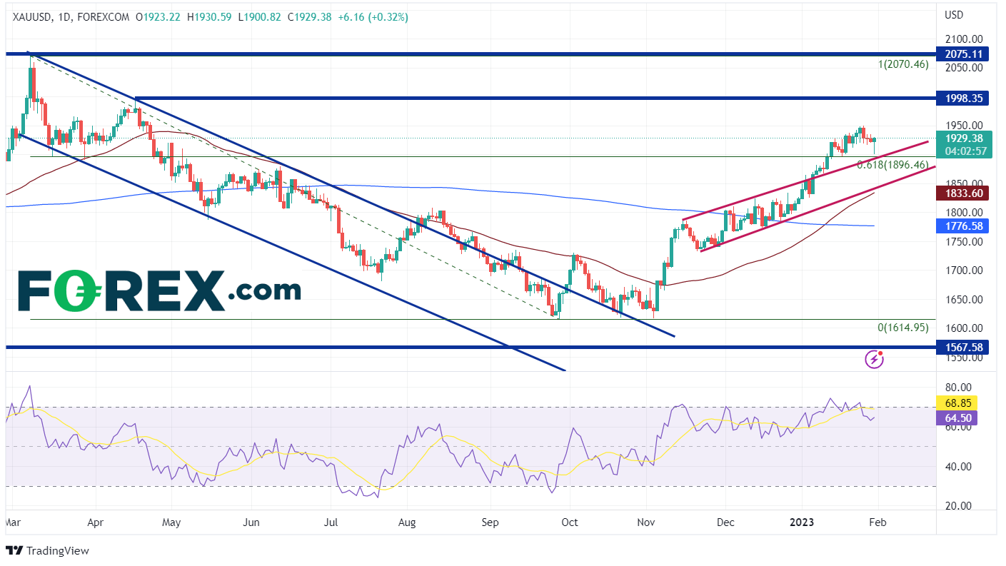 在日线图上,黄金在下行通道中稳步走低,从202238日的2070.46下跌至2022928日的1614.95930日,黄金横盘整理打破通道,然后开始积极走高。黄金交投于50日移动平均线上方,并在2022年底形成新的上行通道,收于1823.9216日,黄金突破通道顶部趋势线,然后突破从20223月高点到20229月低点区间的61.8%斐波那契回撤位1896.46126日,黄金创下1949.23的高点,随后在明天的FOMC会议前获利回吐。