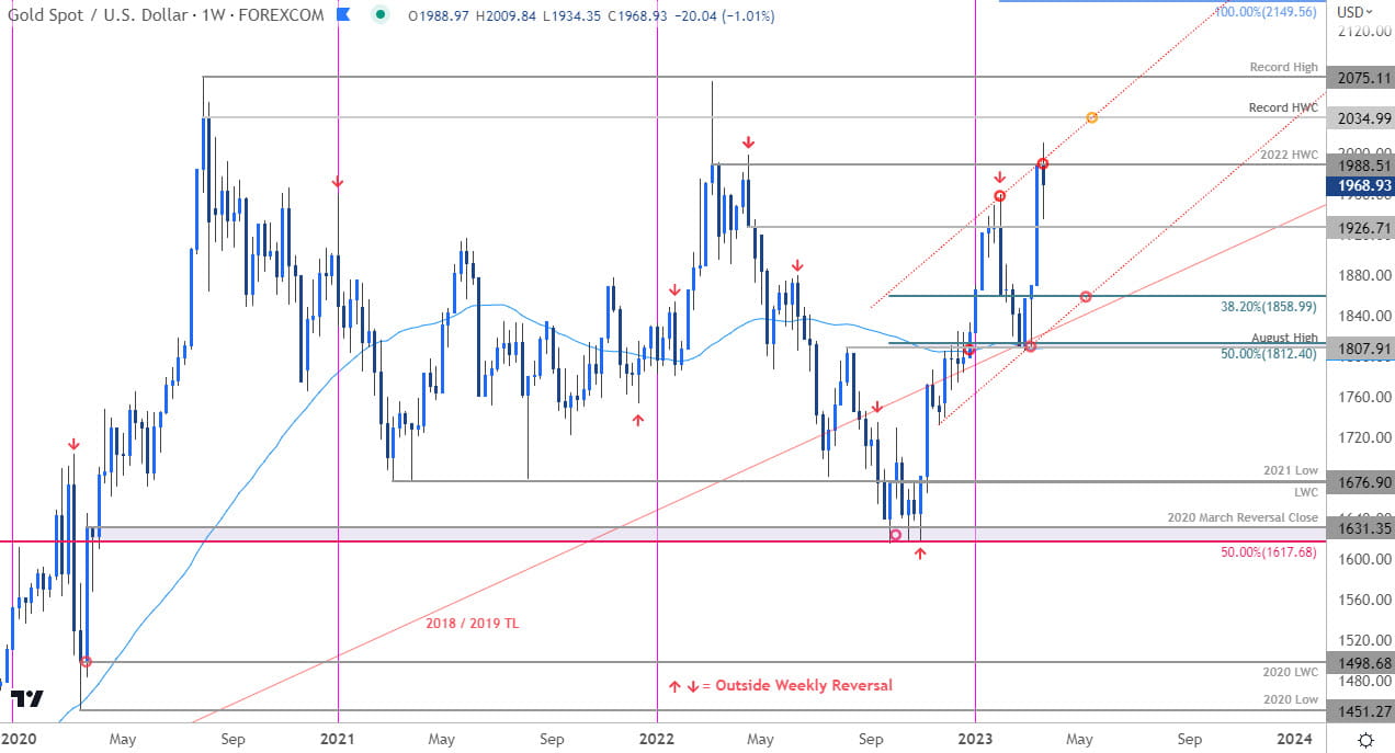 上破/收于上平行线(红色)上方可能会推动另一次加速反弹,迈向创纪录的周线高位收盘价2034和历史高点2075