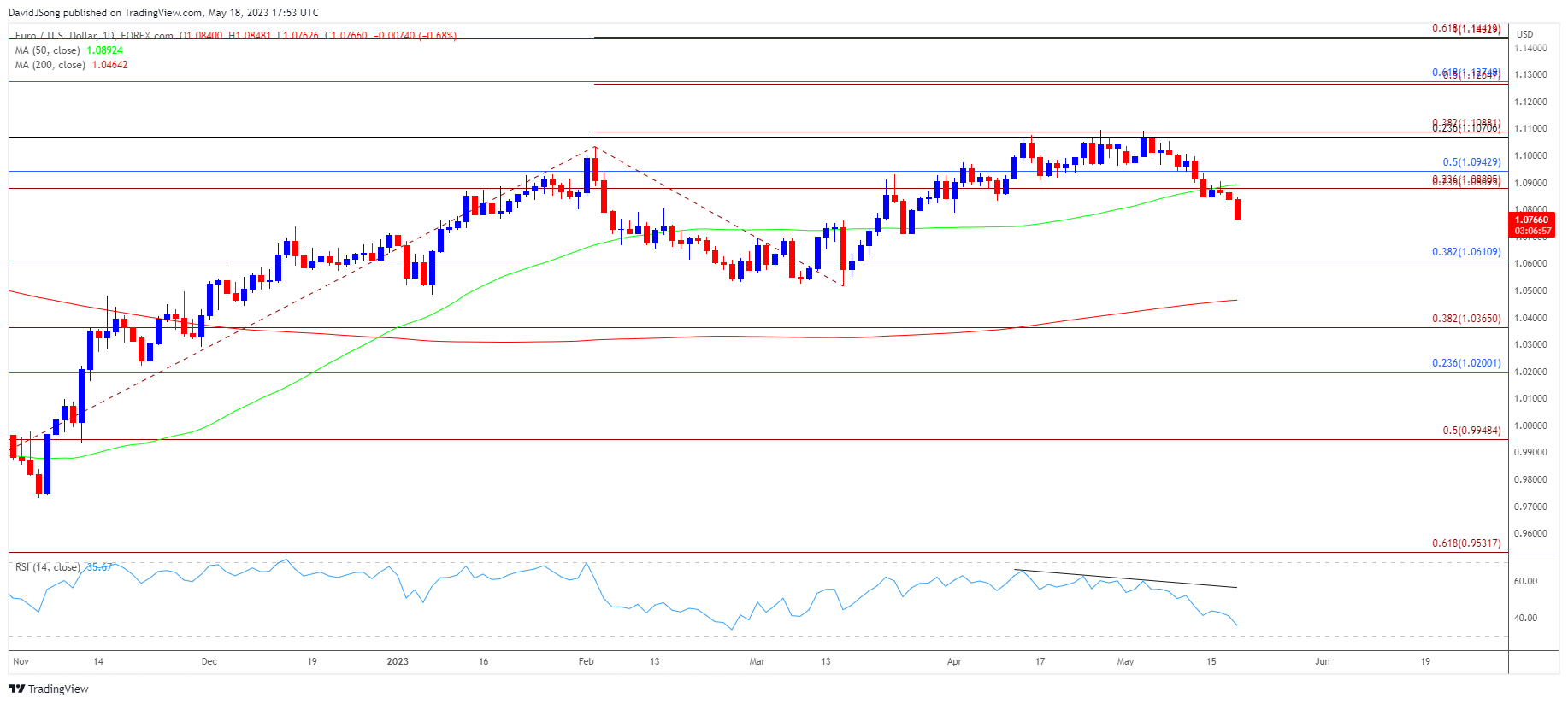 - 突破/收盘价低于1.0610(38.2%斐波那契回撤位)很可能会下探3月低点(1.0516),欧元/美元的进一步下跌可能会继续将相对强弱指数(RSI)推向超卖区域,因为该振荡指标仍显示下降趋势。
