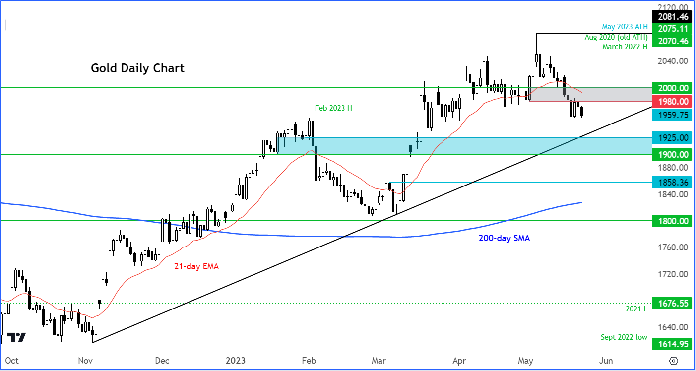 众议院议长凯文·麦卡锡表示,他已与乔·拜登总统就债务限额进行了“富有成效”的会谈。从双方的积极氛围来看,似乎可能会在最后一刻达成一项避免违约的协议。因此我们看到一些美国股指在最近几天升至数月新高。可能是因为股市的表现,今年早些时候表现亮眼的黄金现在并不受青睐。