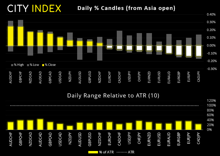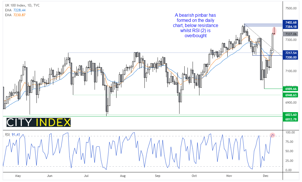 富时100指数日线图上收于看跌pinbar,上行止于11月7400附近高位略下方。鉴于RSI(2)同样超买,价格在强劲反弹后,远超其10天和20天均线水平,我们认为富时或面临部分均值回归行情。