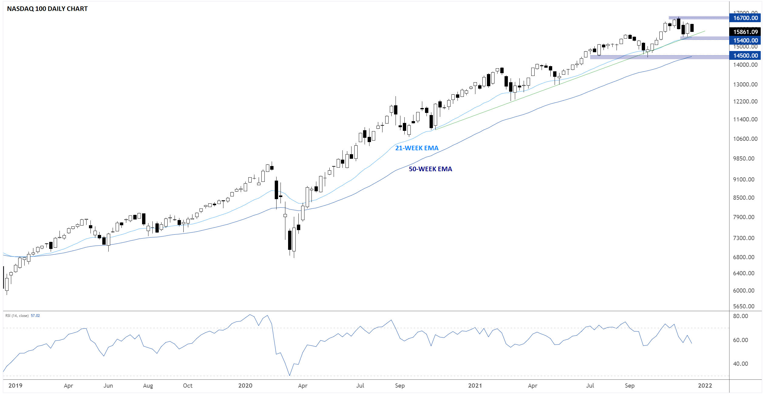 将目光投到大西洋对岸的德国,我们发现其交易广泛的DAX指数在2021年表现落后于美国股指,过去三个季度更多的是横盘,而没有走出明确的趋势。如果2022年全球股指受挫,本就落后的DAX40指数可能更易遭到抛售。年初的关键支撑位在14800区域,如果突破,合乎逻辑的支撑位可能要到13500附近,那是2020年下半年的阻力位,也是2021年年初以来的支撑位。而如果出现确认站上16200这一更为看涨的情境,可能打开持续上涨的空间,后市摸至17000上方历史高点区域: