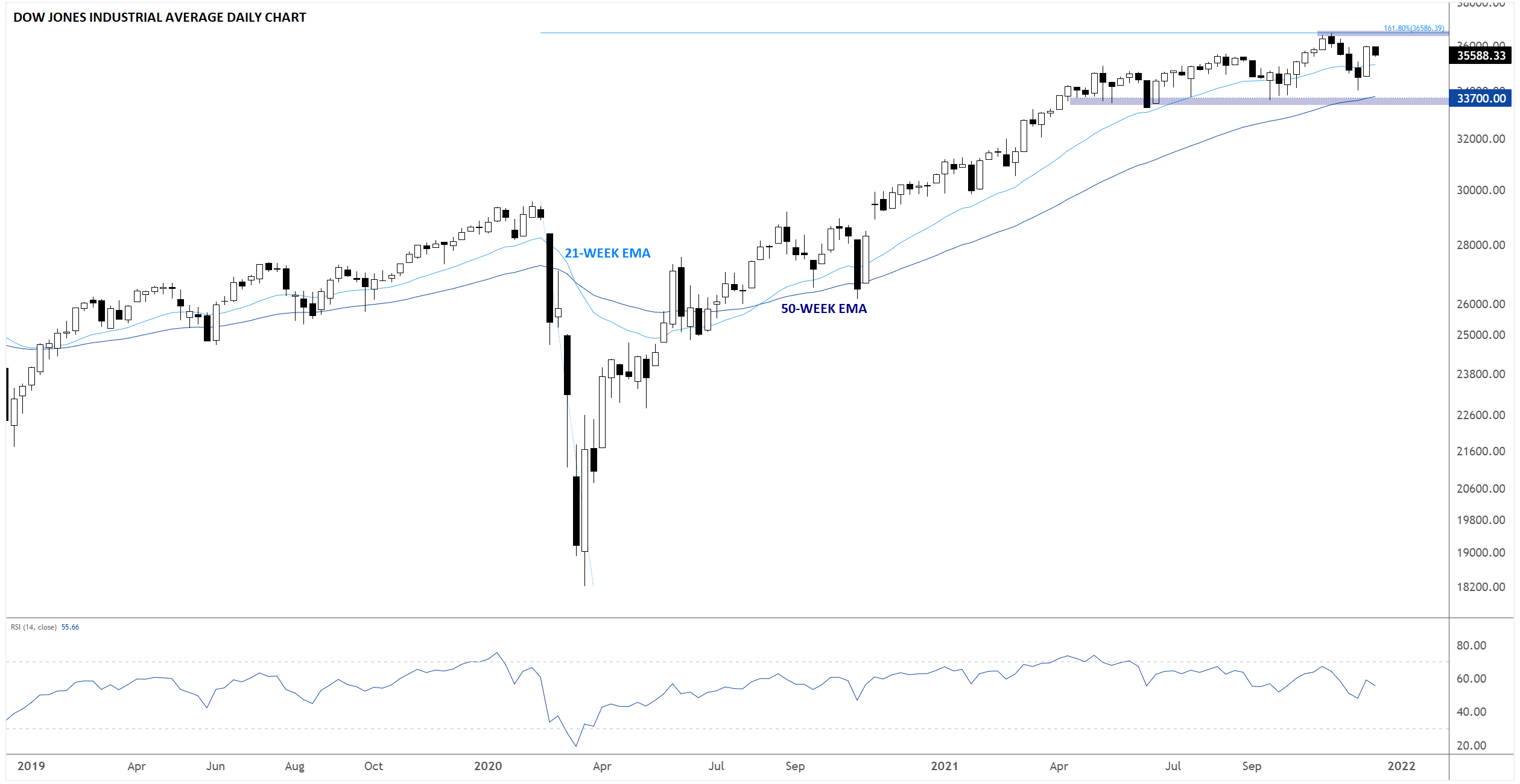这个编制于1896年的现代指数的“鼻祖”,现在仍是全球最受关注的股指之一。截至发稿时,道指正从疫情造成的暴跌行情的161.8%扩展位36,600附近回撤,但暂时仍处于疫情后期的上升趋势中。