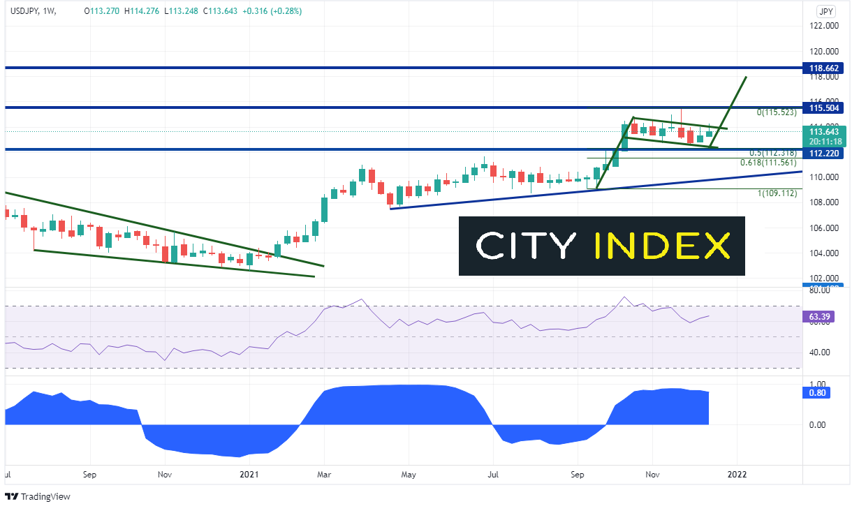 在负利率和大规模宽松计划背景下,美元/日元对日央行决定反应冷淡,相反,该货币对与10年期美债收益率相关性更为密切。周线图相关系数为+0.80。系数高于+0.80,则视为两种资产之间存在很强的相关性。因此,若美债收益率上升,美元/日元也应走高。2021年初,美元/日元升穿2020年2月122.12高点以来下降楔形103.55附近。货币对此后回撤楔形高度并最终站上前高点上方。在此过程中,美元/日元测试115.52阻力位,并回落至112.12旗形支撑位。若汇价继续走高,旗形目标为旗杆高度+突破点,即118.0附近。但货币对首先必须拿下114.00附近顶部趋势线阻力及近期高点115.52。112.12附近前高点阻力位及2021年9月低点至2021年11月高点上行之50%回档现充当首个支撑。同时期走势之61.8%回档落在略下方的111.56,然后是2021年4月以来上斜趋势线110.00附近。