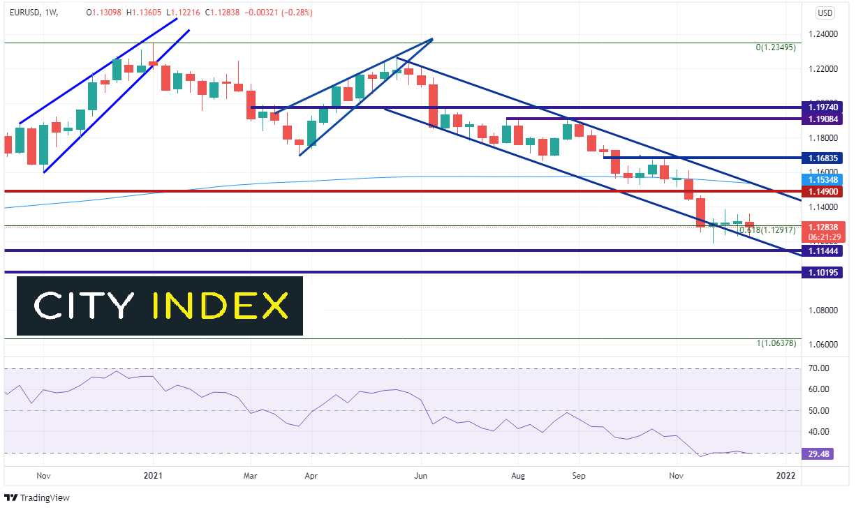 在下破1.2250附近上升楔形后,欧元/美元自2021年5月以来一直在有序通道中下行。货币对2021年11月15日当周下穿该通道,探入近期低点1.1186。该水平略低于2020年3月低点至2021年6月高点上行之61.8%斐波那契回档1.1292。自那以来,欧元/美元保持横盘交投并重回通道内部。1.1490在过去两年间一直充当关键阻力和支撑,现在仍然于下斜通道顶部趋势线处构筑阻力。200周均线落在略上方的0.1534,上方水平阻力在1.1683。如果欧元/美元再次跌破通道底部趋势线,长线水平支撑在1.1144和1.1020。若跌破,则为探向1.0636附近2020年3月低点打开大门。