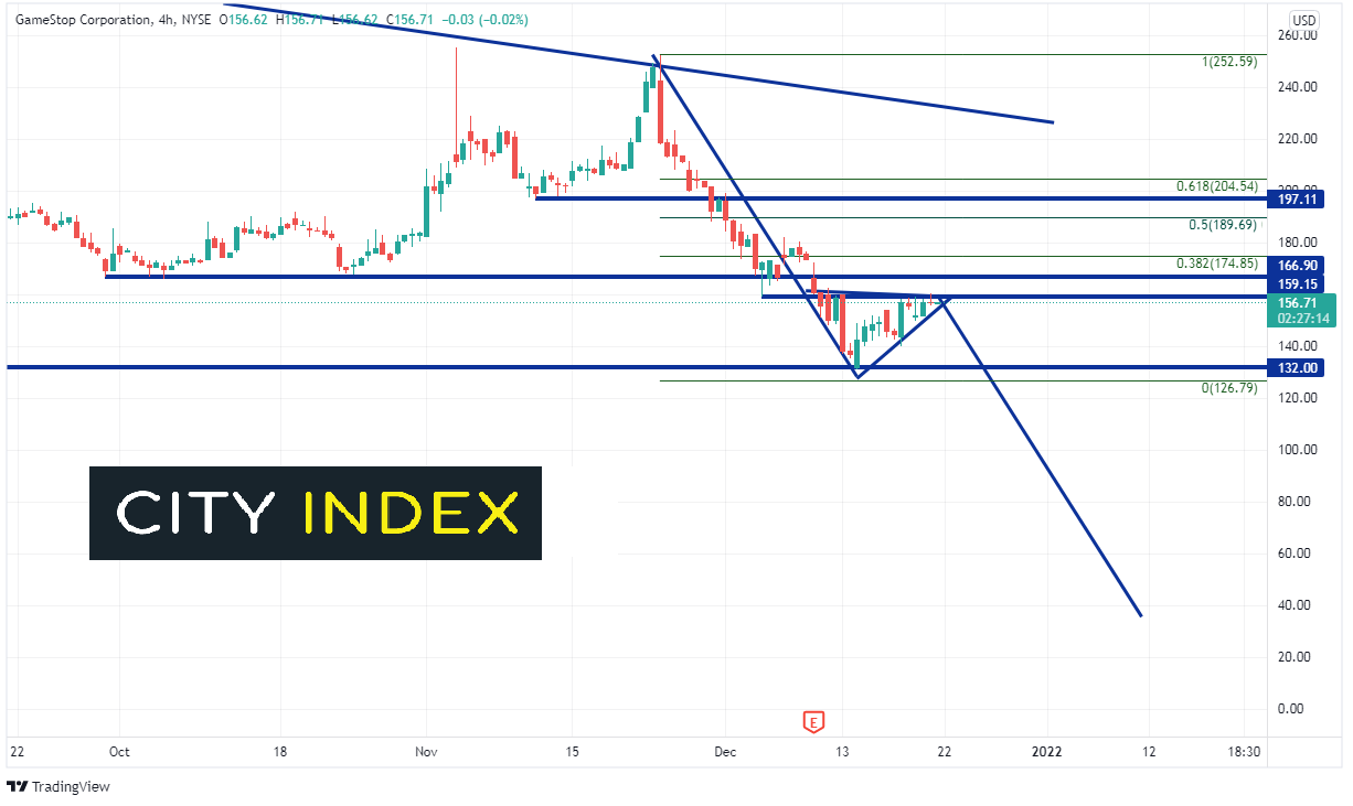 240分钟时间轴上,GME似乎于水平阻力位159.15附近上行走势停滞。该阻力位也落在旗形顶部趋势线。旗形下破目标为旗杆高度+下破点,即36.50附近。股价必须首先下穿水平支撑126.79和86.00(详见日线图)才能继续下探目标。如若价格上扬,第一个水平阻力位在159.15。上方为分别落在174.85和189.69的11月22日高点至12月13日低点下行之38.2%和50%回档位。