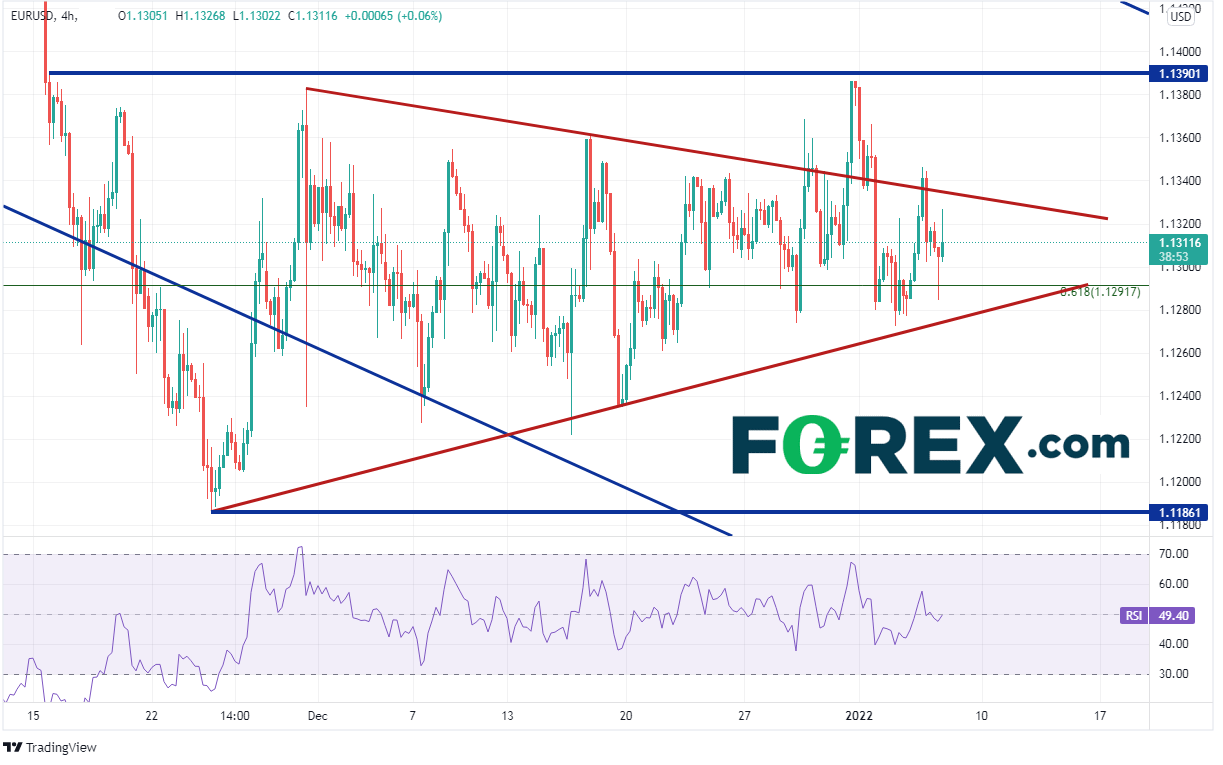 但此文发稿时欧元/美元基本持平,而且4小时图显示其自20211115日以来的近2个月里一直交投于1.1186-1.1390这一大约200点子区间内。而且,欧元/美元已经形成对称三角形,目前逼近形态相汇点(保持低波动状态直到实现重大突破)。