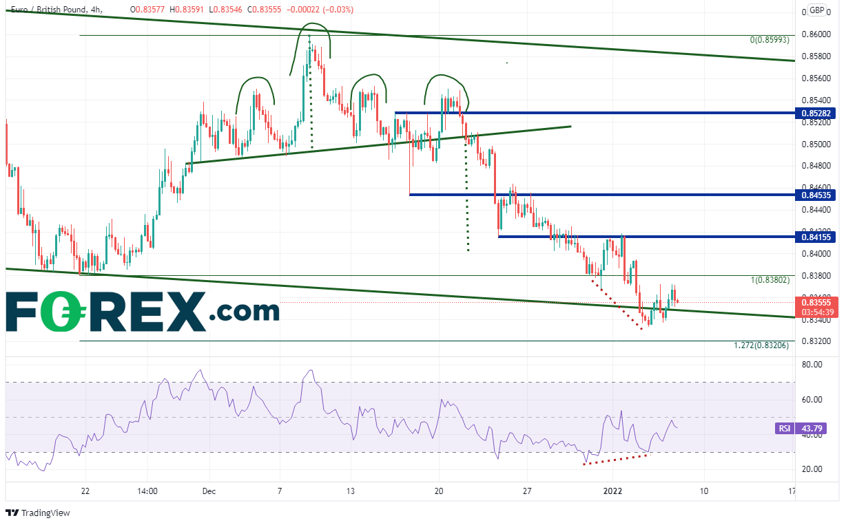 欧元/英镑4小时图同样区间波动,交投区间为0.8330-0.8600,波幅在270点子左右。但和欧元/美元交投于三角形内不同,欧元/英镑从2021128日的区间高点一路走低,形成了头肩顶形态(有两个右肩)后在20211222日强力下破颈线0.8510。头肩顶形态的目标为颈线突破位加上头部到颈线的高度,而欧元/英镑在1228日到达其目标,即0.8400附近。该货币对此后继续下跌,目前已自长期下降趋势线的下轨趋势线,即0.835020211119日低点到128日高点行情的127.2%扩展位,即0.8320附近反弹。