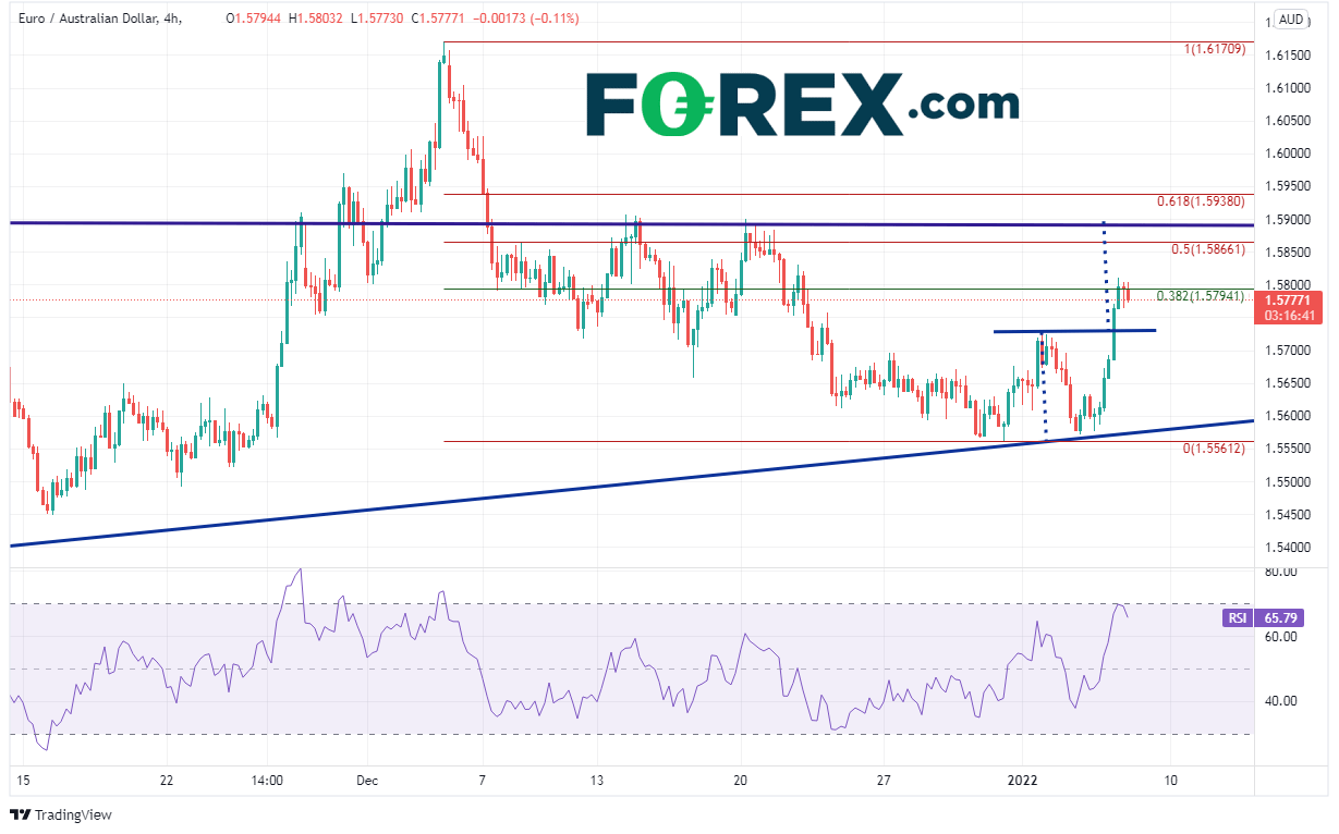 另一个可以关注的欧元货币对是欧元/澳元。该货币对自20211115日以来一直交投于1.5458-1.6171区间内,区间高度超过700点子。欧元/澳元在123日最高到达1.6171后开始下跌,于20211231日和202215日构筑双底,并在16日突破双底颈线后开始上攻1.5900附近的目标,但受制于123日高点到近期双底行情的38.2%回档位,即1.5794附近。请注意,RSI逼近超买,后市价格可能等待RSI进一步缓解超买状态进入中性,在这期间或许继续盘整。
