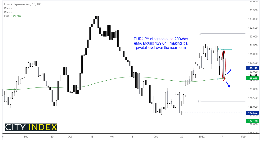 另外还需密切关注欧元/日元。欧元/日元是昨天表现最糟的货币对之一,汇价收于当天(非常看跌的一天)低点。货币对在200天指数均线上方徘徊,希望能于此获撑,虽然自此类技术里程碑启动反弹是一种惯性,但我们预计汇价不会企稳上方太久。空头可能会在小幅反弹攻向130.20区域之时入场推低(卖出),在我们看来,跌破129.50将为下阶段跌势开路。