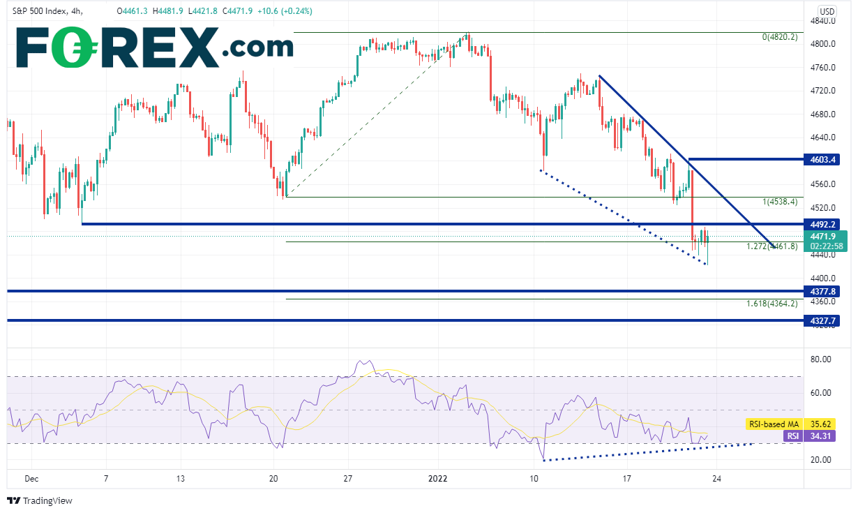 4小时图RSI同样与价格严重背离。价格如果确实反弹,上方会先后面临前低点4492.2附近和由下降趋势线与水平阻力位构成的阻力带,即4538附近。如果攻克,上档阻力在1月20日高点4603.4。但若价格继续下跌,则日图上的第一个支撑在4377,如果失守,下看2021年12月20日低点到历史高点行情的161.8%扩展位,即4364.2附近。再接着是水平支撑位4327.7和4272.2。