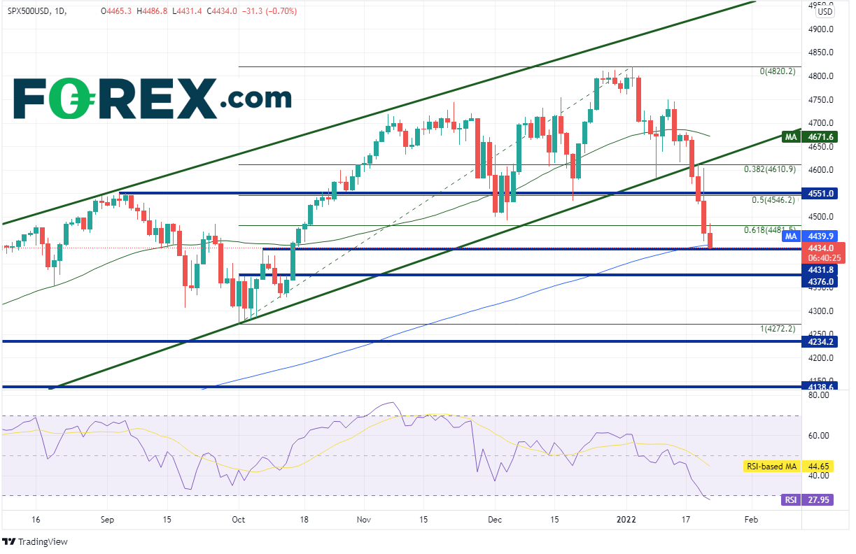 在以上种种不利因素综合作用下,标普500指数出现疫情爆发以来最大日内跌幅。但该股指的大幅下跌行情肇始于数周前,即在1月4日创下历史新高之后。标普500指数击穿了2021年10月1日低点到2022年1月4日高点行情的61.8%回档位,即4481.5附近,攻克了200天均线4439.9,目前报在水平支撑位4431.8附近,相较那些历史高点下跌8%。对这些价位的迅速击破会带来反弹空间吗?日图下个支撑在4377附近。请注意,RSI处于30下方的超卖区域,表明股指或准备反击。