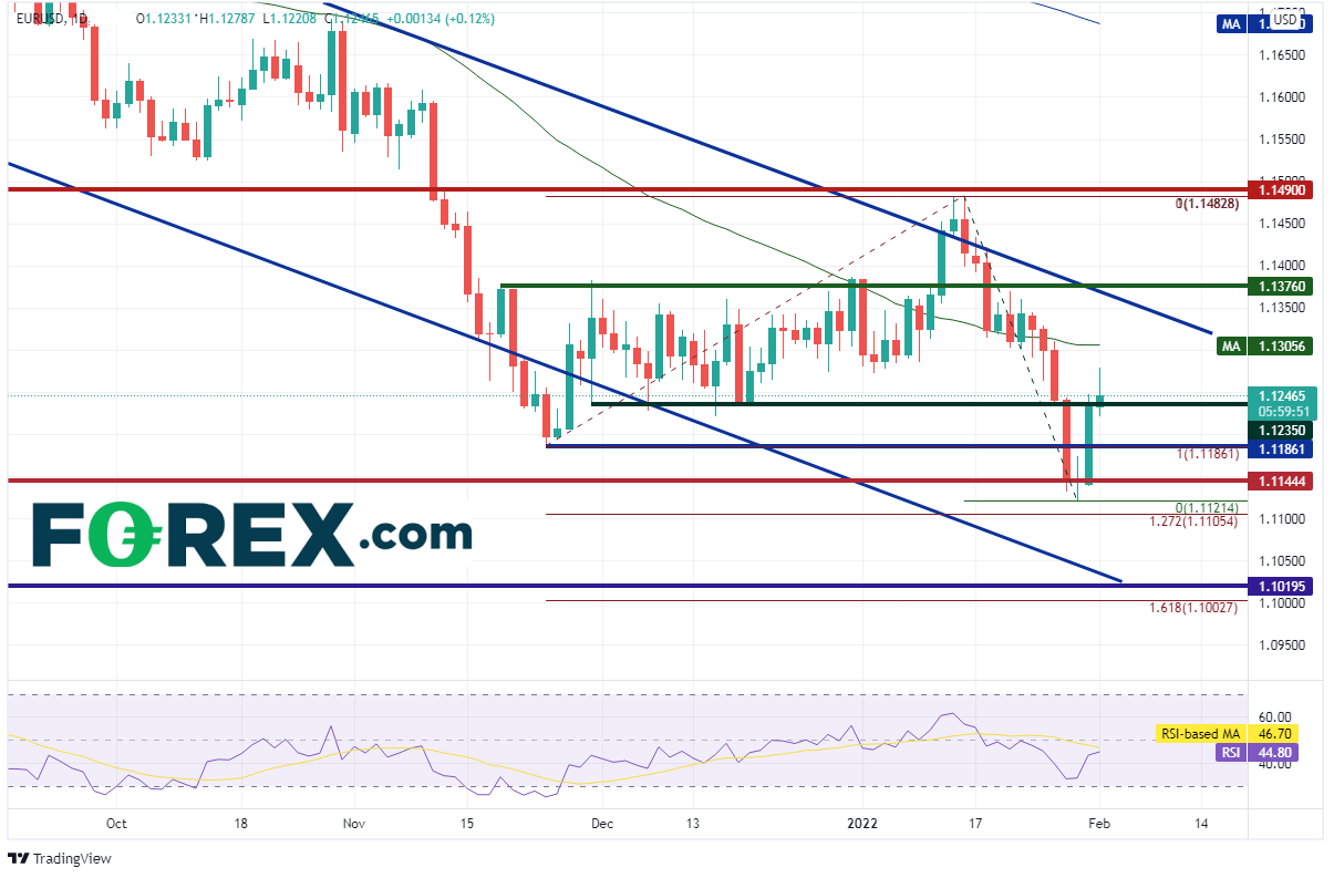 欧元/美元从2021年5月以来一直处于下降通道中,一度于11月底下破此通道,之后横盘回到通道内,只在2022年1月中旬向上测试。2021年12月到2022年1月期间的横盘区间基本落在1.1235 - 1.1375(请看下图绿色线)。该货币对于1月27日下破前述通道与11月24日低点1.1186,但于1月28日形成十字星、1月31日构筑长阳线,早晨之星形态成形,暗示后市向上反转。