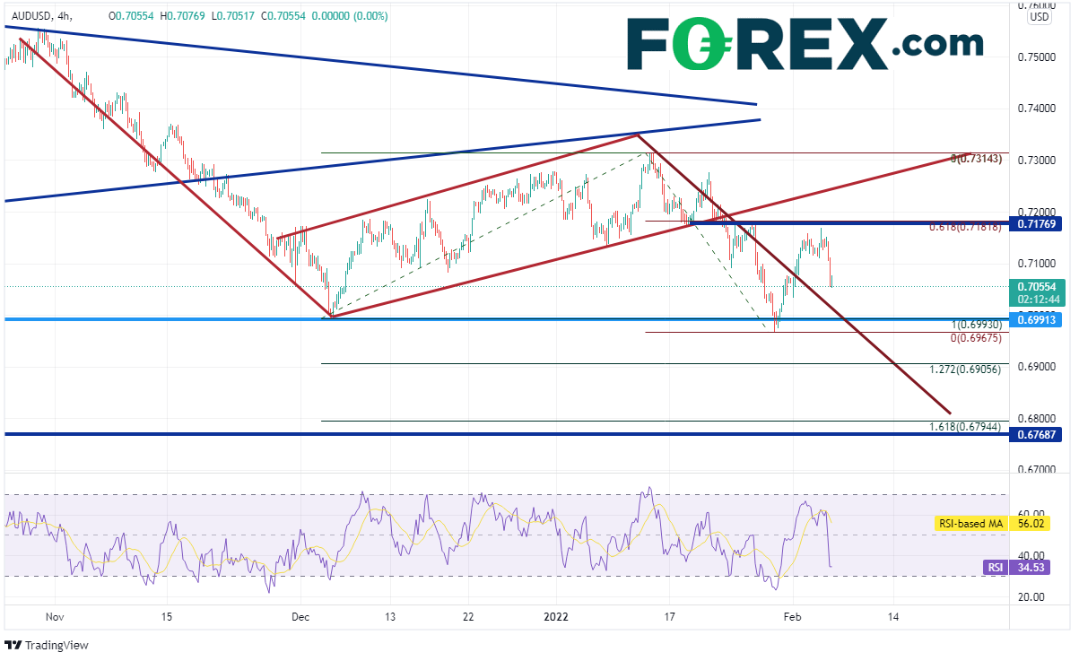 澳元/美元4小时图跌至0.6990支撑位后再度反弹,这次摸至113日高点到128日低点行情的61.8%回档位,即0.7175附近。该位在50天均线附近,而水平阻力位也落在0.7182附近。在非农就业报告的作用下,该货币对重拾跌势,下探旗形目标。