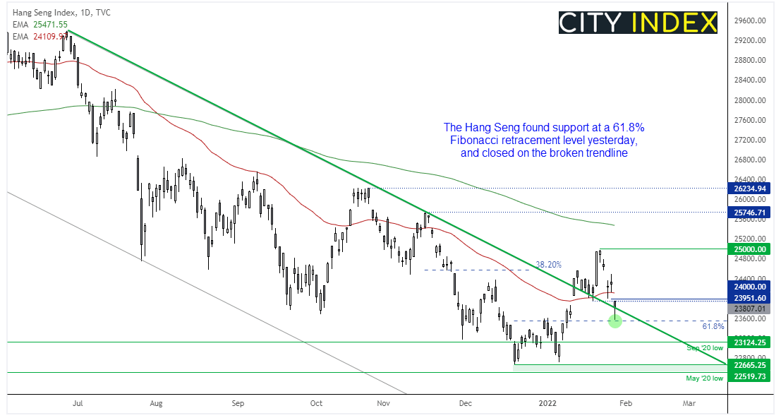昨天的下挫于61.8%回档获撑,这是个利好信号,股指得以随之收于看跌通道(现已破)上行趋势线之上。期货市场指向开盘上行,因此只有重回24100上方才说明波段低点已于24100成形,缺口填平,股指也将升穿50天均线。