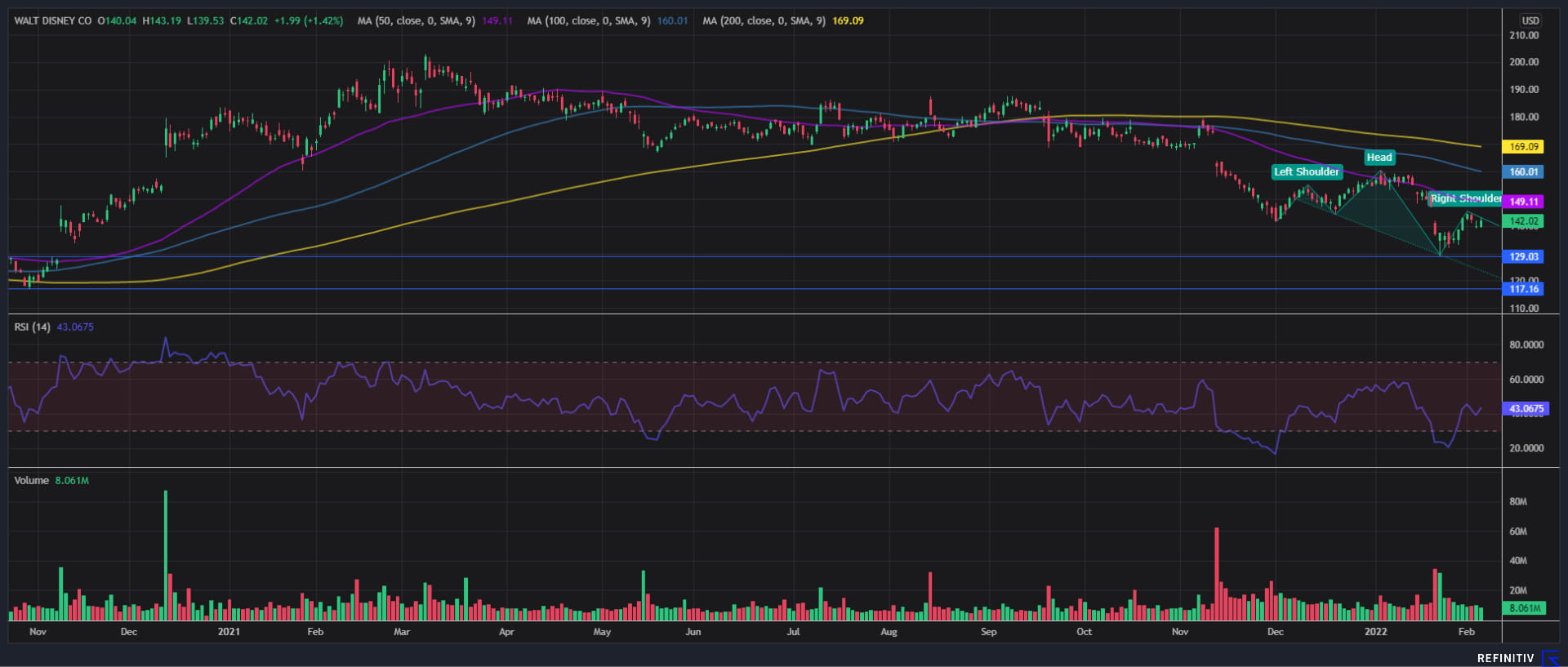 RSI与均线看跌(50天均线、100天均线和200天均线空头排列),表明股价可能进一步承压下行,并且得到了过去三个月可能形成的头肩顶形态的佐证。该形态要想成立,需要价格下破129低点,然后后市可能下探202010月低点117