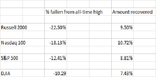 美国四大股指(标普500指数、纳斯达克100指数、道指和Russell 2000指数)中,如果按历史高点以来的跌幅衡量,Russell 2000指数的表现最差。这个小盘股指相比202111月创下的历史高点下跌超过22.5%,进入熊市区域。到目前为止,该股指收复了9.5%的失地。请看下面的对比图: