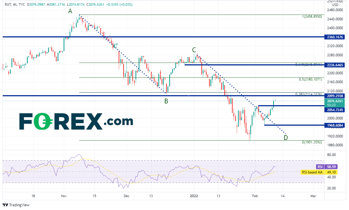 4小时图上的AB=CD形态更加清晰。Russell 2000目前逼近由长期水平通道的下轨趋势线和202111月高点到128日近期低点行情的38.2%回档位组成的阻力带,即2099.25 - 2114.32区间,再往上的阻力落在前述行情的50%回档位2180.11,然后是又一阻力带,由水平阻力位和61.8%回档位构成的2237/2246区域附近。下档支撑位有水平支撑2054.7224日低点1968.60128日低点1901.36