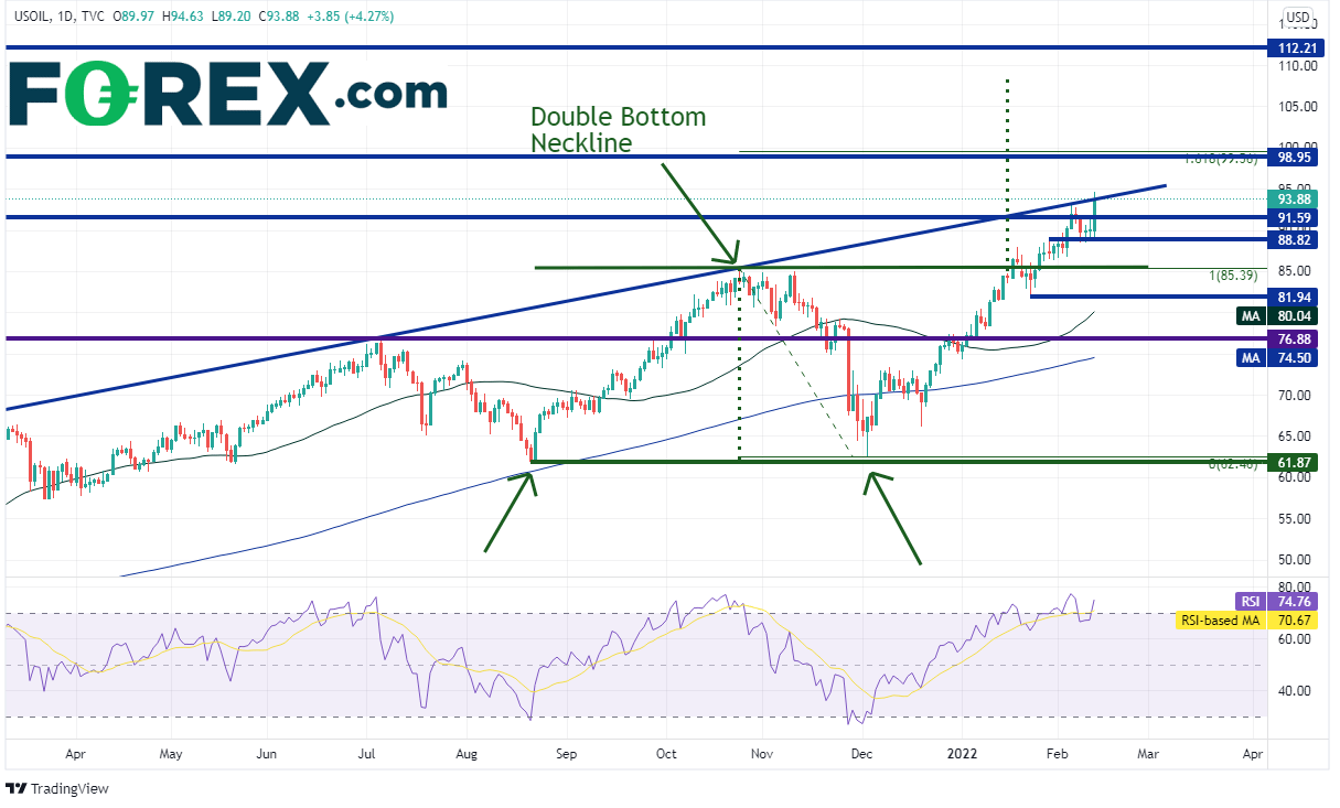 如上所述,西得州原油周五同样在俄罗斯方面的消息作用下自91.12走高至94.63,途中击穿长期上斜趋势线94.00附近。如果负面消息不断,油价可能上看98.95 - 99.56阻力区间,其由2014年以来的水平阻力位、20211025日高点到122日低点行情的161.8%扩展位组成,以及100.00的心理整数关口。请注意,西得州油价于1月中旬打破了双底形态的颈线,目标指向108.10附近。