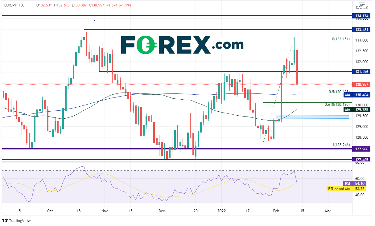 上周在白宫言论发布后,市场初步呈现上述走势。欧元/日元自132.00上方跌至200天均线130.39。如果入侵的威胁不消除,欧元/日元可能跌至127日低点到210日高点行情的61.8%回档位,然后下看50天均线129.79129.34-129.53支撑区间以及125日以来低点128.20